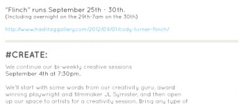 October 19, 2012 by adminJoin us November 8th-25th as abstract artists Claudia Yarur, and Jimmy Chiale fill #Hashtag Gallery with large colourful works of art in this “must-see” show! About Claudia’s Work: “I consider the practice of painting always as an exercise where I have the intention to arrive at or achieve a certain state of mind. This particular […]